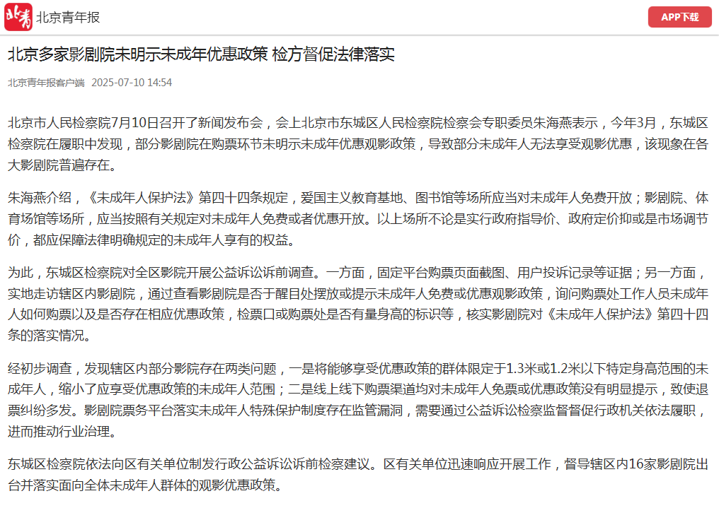 7月10日,北京青年报客户端报道《北京多家影剧院未明示未成年优惠政策 检方督促法律落实》《被溺爱男孩接触不良群体后犯罪 检察机关助其回正轨》。