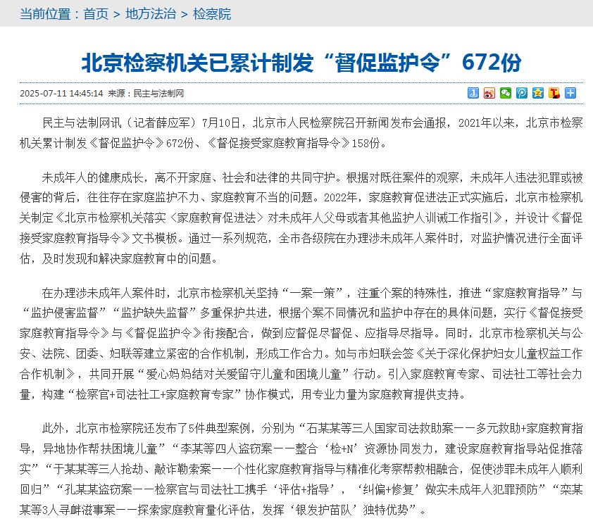7月11日,民主与法制网报道《北京检察机关已累计制发“督促监护令”672份》。