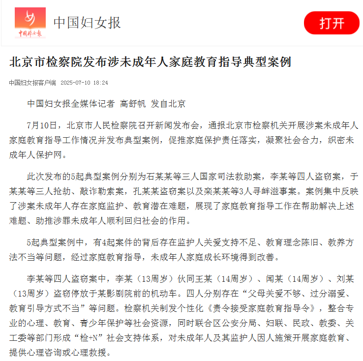 7月10日,中国妇女报客户端报道《北京市检察院发布涉未成年人家庭教育指导典型案例》。
