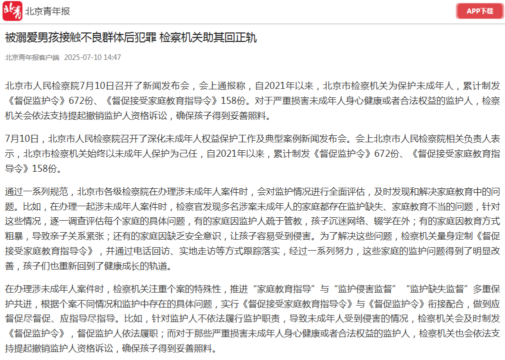 7月12日,中国青年报客户端报道《北京检察机关累计制发督促监护令672份 为未成年人筑牢家庭防线》。