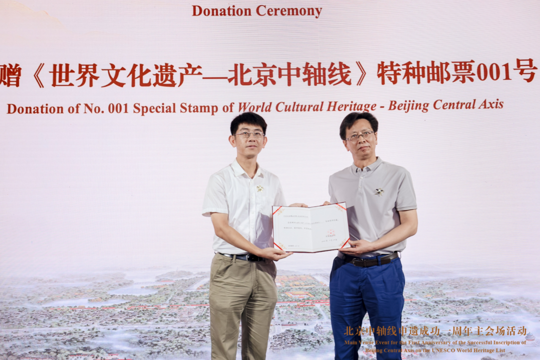 《世界文化遗产——北京中轴线》特种邮票启动发行。这是北京中轴线成为世界遗产后首次发布特种邮票,此次发行1套5枚,分别呈现了钟鼓楼、景山、故宫、天安门、正阳门、永定门等多处中轴线遗产点位。设计采用中轴对称的构图布局,融合传统青绿重彩的意韵,展现出北京中轴线建筑之美。活动现场,中国邮政向首都博物馆赠001号特种邮票。