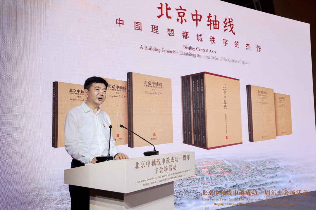 《北京中轴线:中国理想都城秩序的杰作》丛书首次发布。丛书共5卷,包括中文版3卷、英文版2卷,内容为北京中轴线申报世界文化遗产文本、北京中轴线保护管理规划以及中轴线各遗产构成要素数百幅建筑测绘图。这是一部加强文化遗产保护传承、总结北京中轴线申遗优秀成果经验的权威著作,具有非常高的历史、人文和科研价值。大中小学校、首都图书馆、社区书店、遗产管理代表、留学生代表在活动现场接受了赠书。