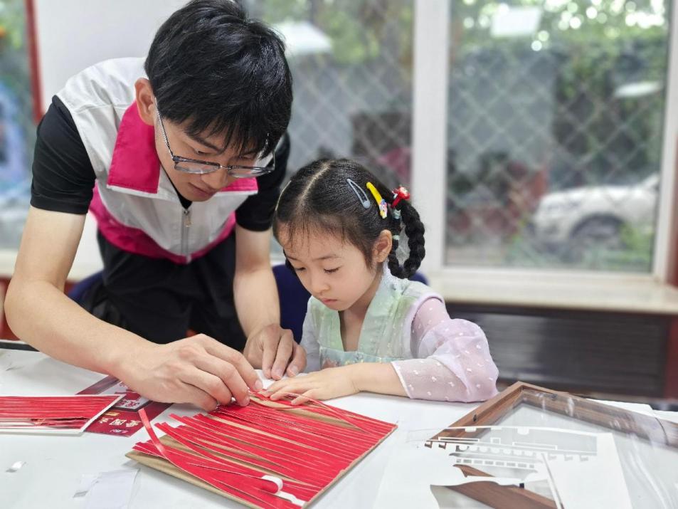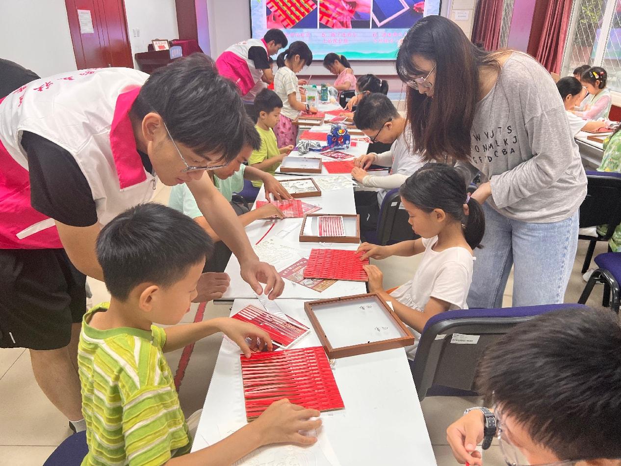 青少年志愿者帮助小朋友制作竹编画,并为他们讲解制作竹编画的注意事项。