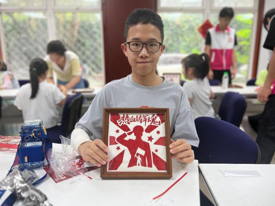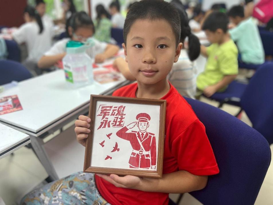 经过一个小时的齐心协作,孩子们手中的竹篾化作“致敬军人”“热血铸军魂”“我爱祖国”等一幅幅饱含深情的竹编作品。所有作品完成后,孩子们庄重地举起这些融合非遗技艺与爱国情怀的作品合影留念。