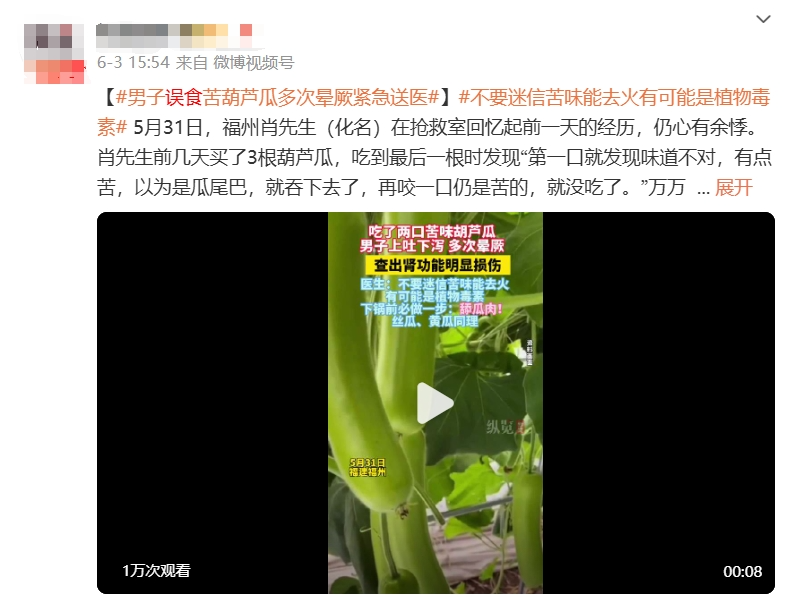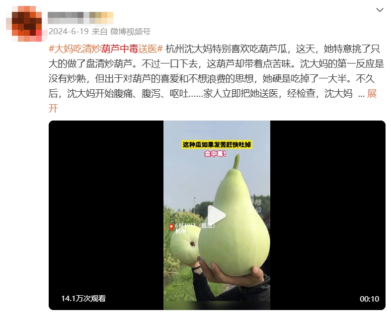 每年夏天都有误食发苦的葫芦瓜、丝瓜中毒的案例。