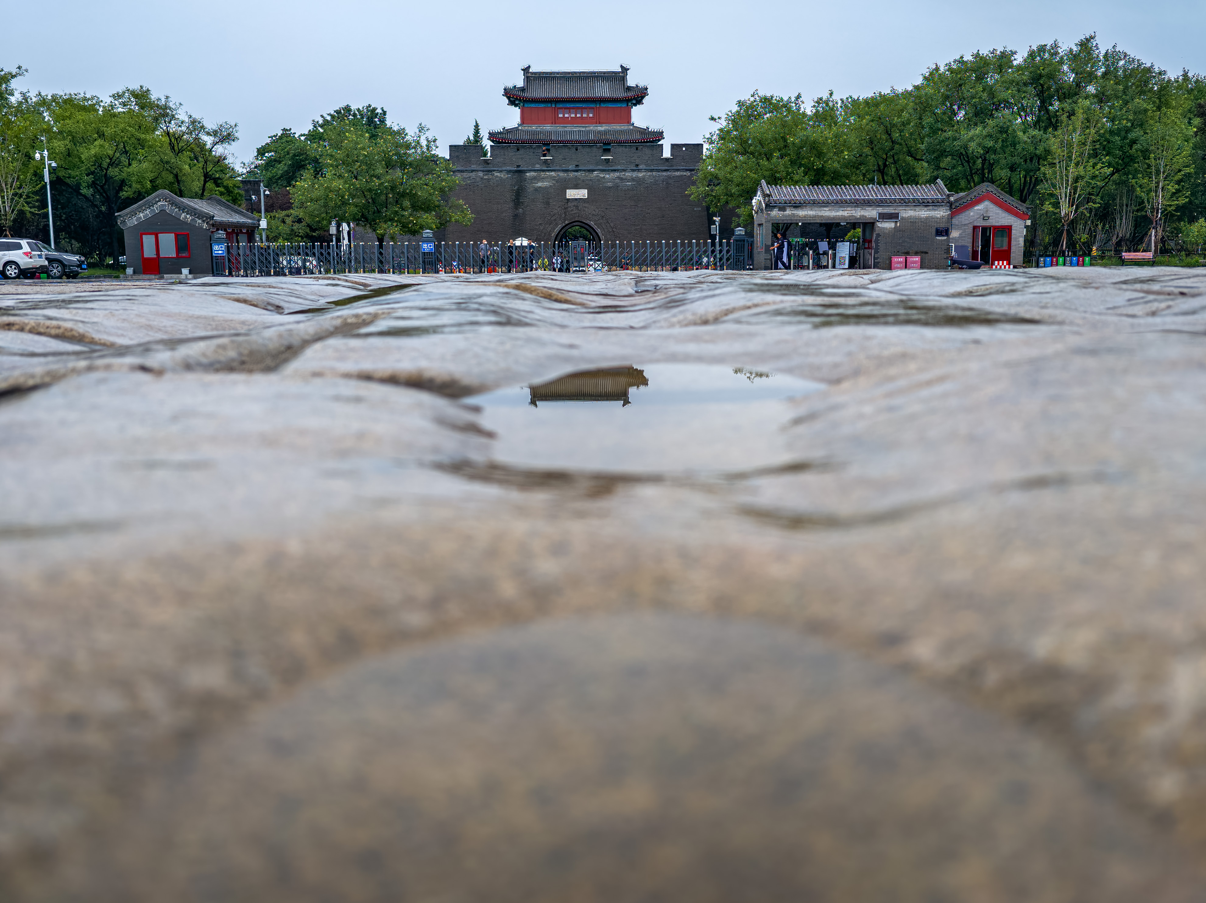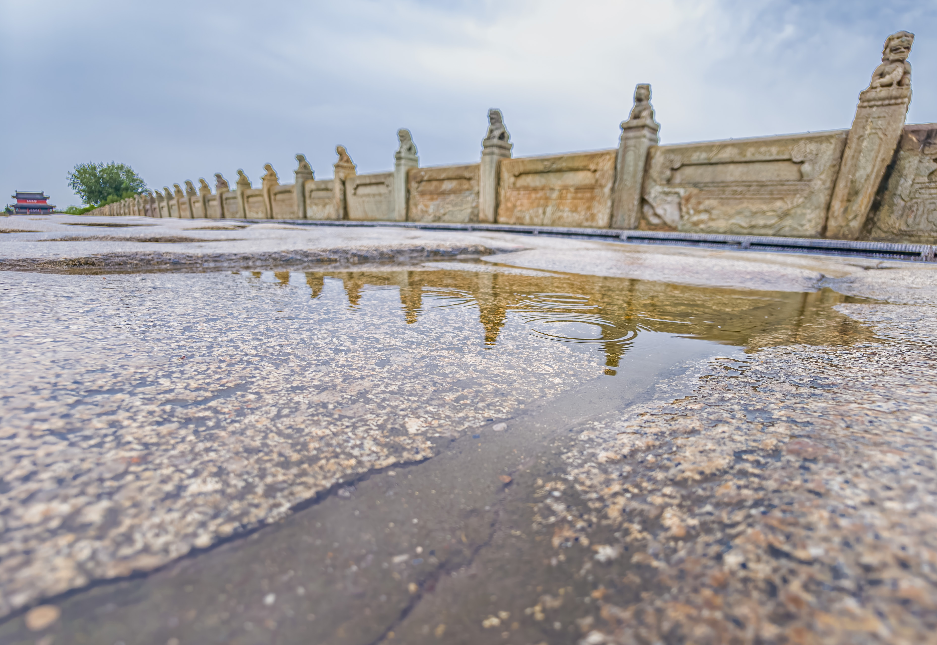 雨水洗刷后的卢沟桥干净整洁。桥面上,坑洼不平的老石板路积下片片雨水,形成一个个小水洼。天空偶有雨滴飘落,在水面激起涟漪。驻足蹲身,水洼中清晰倒映出卢沟桥上形态各异的石狮,别有一番意趣。