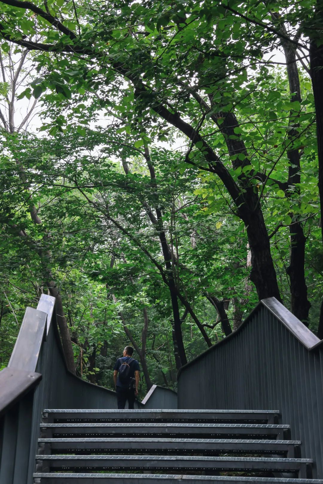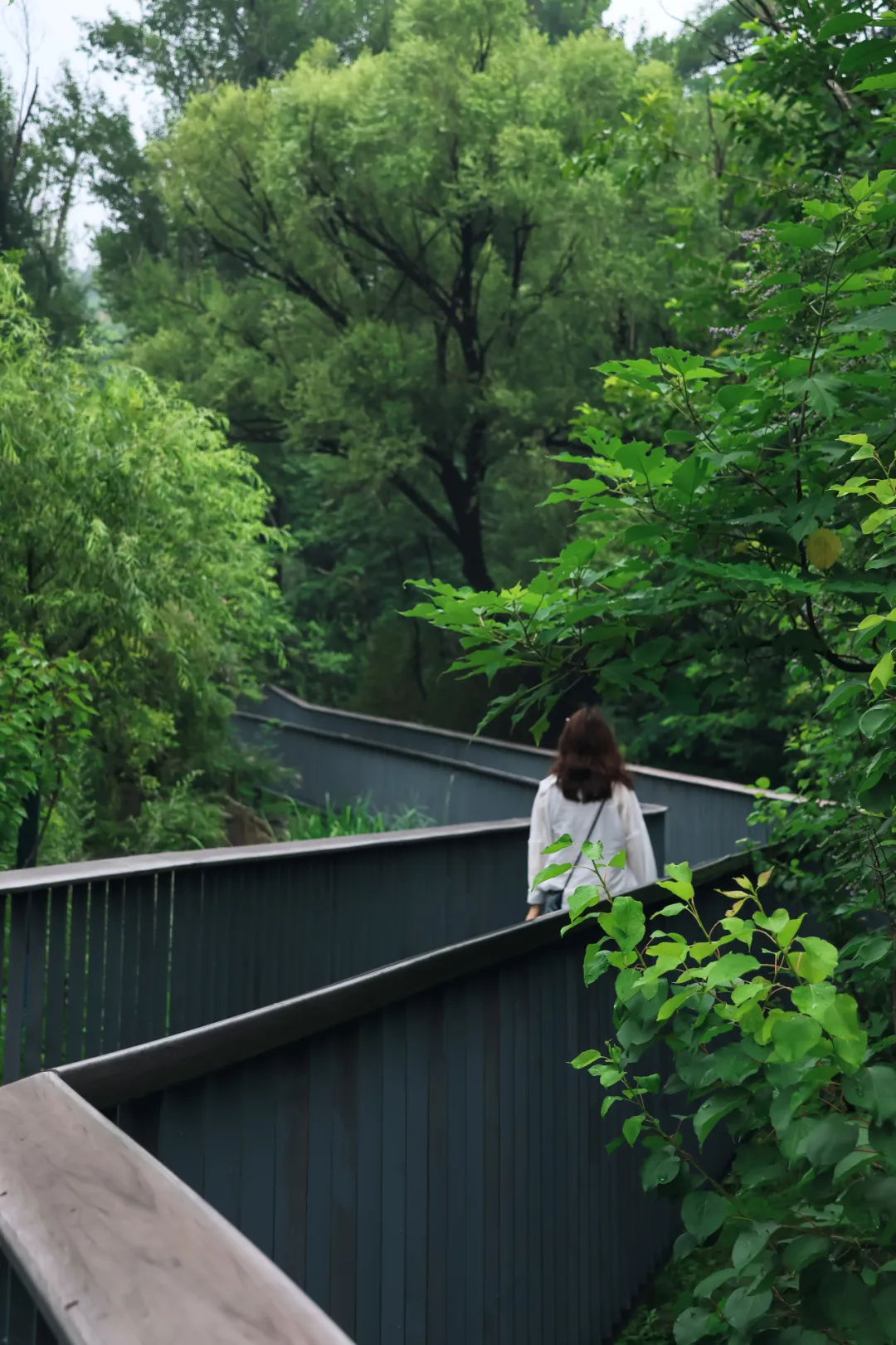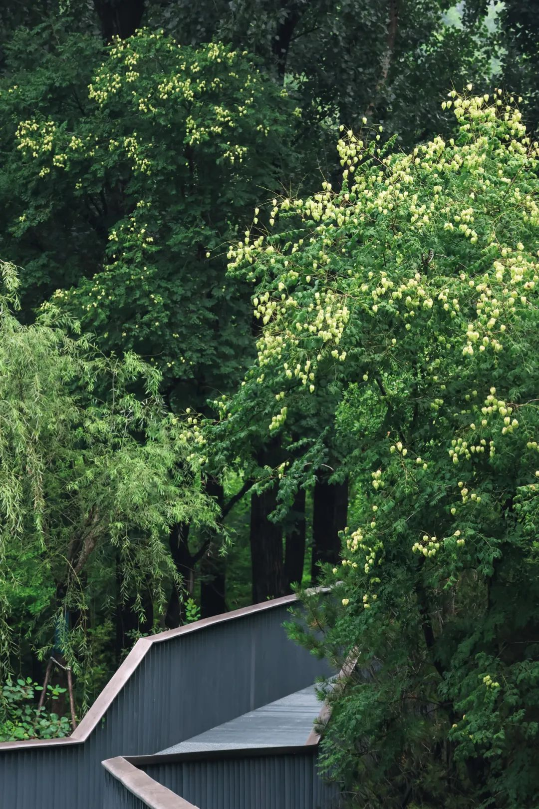 高大的乔木形成浓荫的穹顶,滤去了夏日骄阳的锋芒,在偶尔冒出野草的栈道上摇曳。