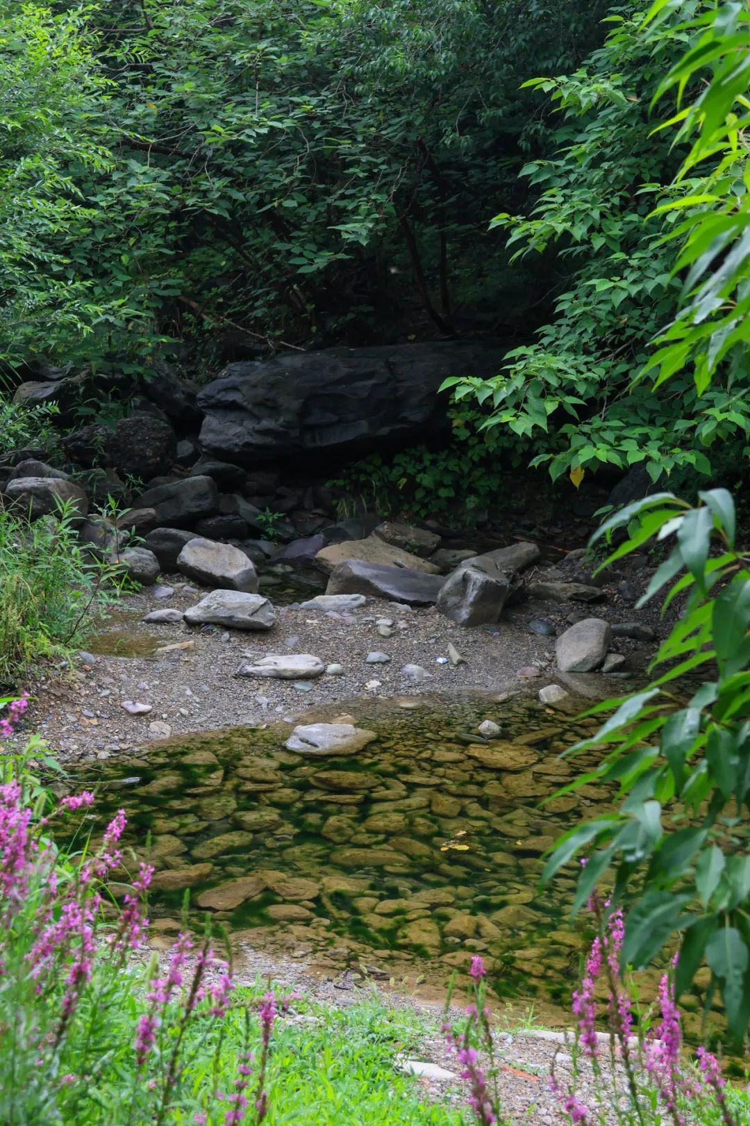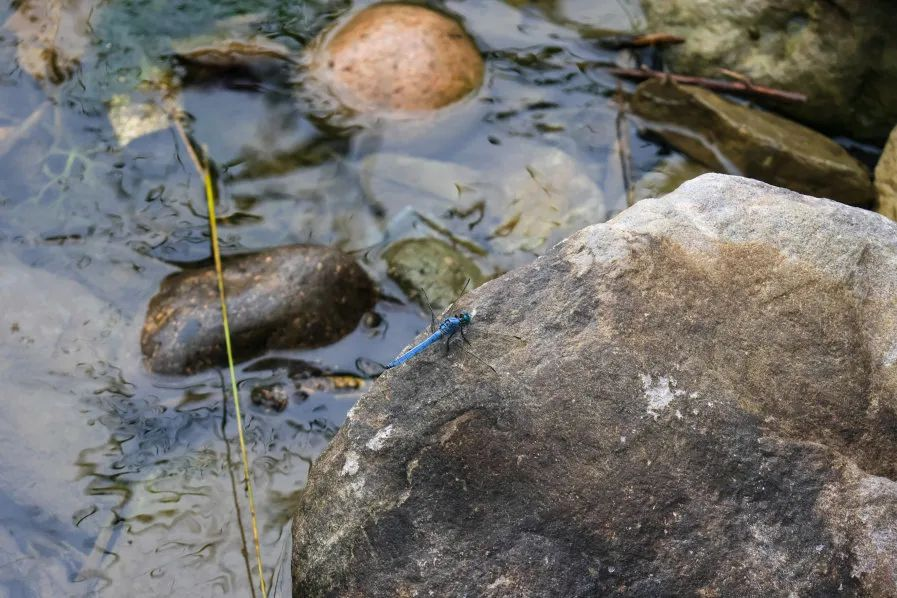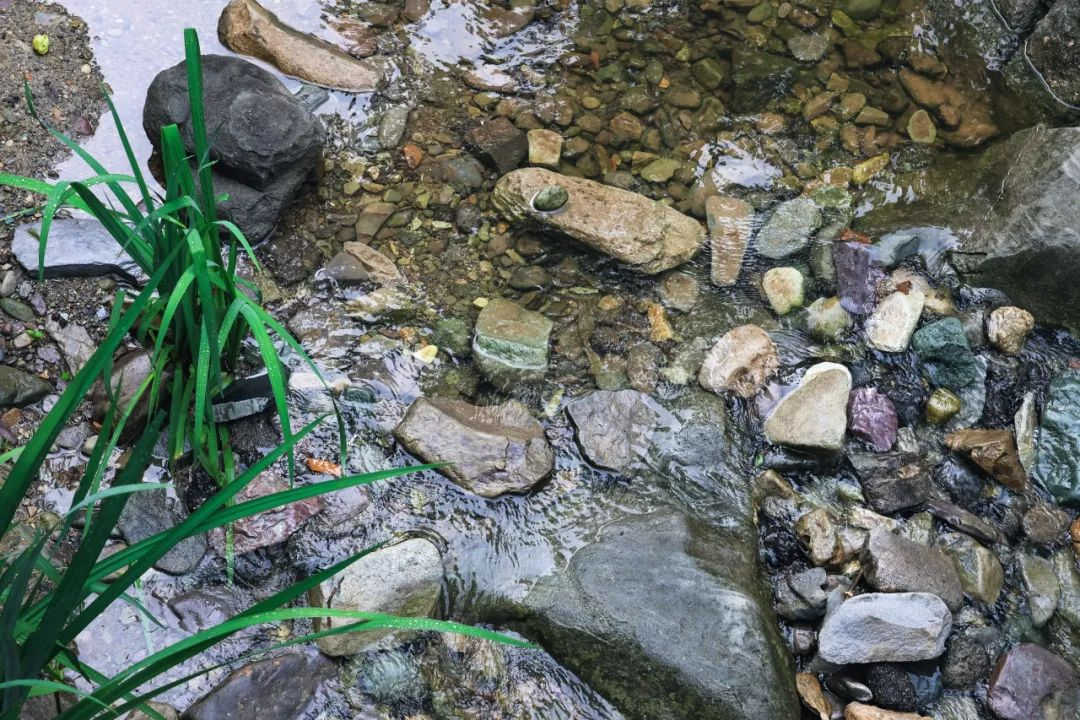 放眼望去,墨绿的苔痕,凝结的露珠,在城市里几乎见不到的蓝蜻蜓也在溪畔石壁上小憩。“清泉石上流”的意境,在此刻有了最鲜活的体验。