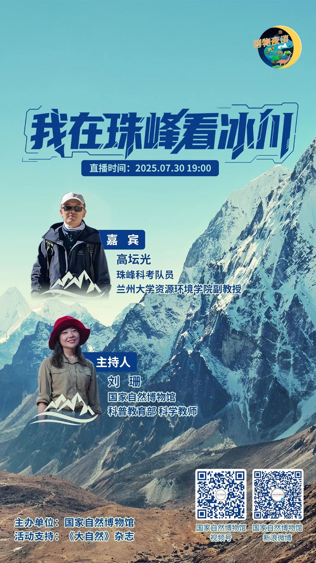 前两期的“探洞寻妖”“毒菇冒险家指南”,你感受如何?本期博物夜谈,我们将继续这场冒险!这一次,我们的目的地是地球之巅——珠穆朗玛峰。在这里,你将俯瞰千年冰川的壮丽奇景。然而,在冰川上行走,每一步都充满未知与挑战。看似平坦的雪地,可能暗藏深不见底的冰裂缝,一脚踏空便是万劫不复。极端环境下,头痛、呼吸困难如影随形,每迈一步都如同背负50公斤重物前行……但这仅仅是环境考验的一角。科考队员们还需肩负繁重的科学任务,在险境中探寻冰川的秘密。