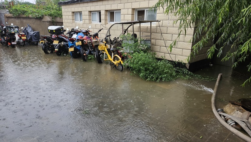 经过连夜的持续降雨,平房区的积水已深达30多厘米,一脚踩下去,积水瞬间没至小腿中部。刘超和同事们迅速行动,第一时间搬出前期已放置在此的抽水泵,并艰难地将其搬到合适的排水位置。