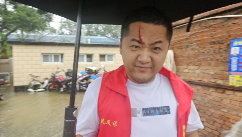 同时,刘超迅速集结社区其他同事,并动员平房居民志愿者团结协作。大家分工明确,有的扶着水泵防止其移位,有的拿着水袋引导水流,还有人在路口指挥交通,保障救援工作有序进行。在众人齐心协力下,不到半小时,积水便被成功排尽。其间,有志愿者找来纸巾,刘超简单擦拭了伤口流出的血迹,便又投入后续工作。