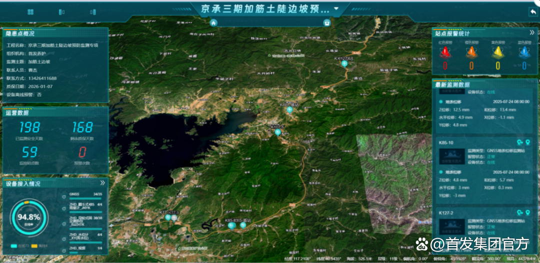 首发养护公司依据雨情实况,在阎村、环铁桥等重点区域部署现场值守力量,为过往车辆筑牢通行安全“防护墙”。依托北斗卫星高精度定位系统和多传感器协同监测网,采取“人工+视频+北斗”方式,对管辖道路内临水临崖、易积水塌方、历史险情路段及桥涵展开地毯式排查。