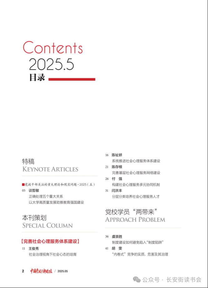 谈哲敏在《中国党政干部论坛》2025年第5期撰文《正确处理五个重大关系 以大学高质量发展助推教育强国建设》指出,习近平总书记在全国教育大会上提出要“正确处理支撑国家战略和满足民生需求、知识学习和全面发展、培养人才和满足社会需要、规范有序和激发活力、扎根中国大地和借鉴国际经验等重大关系”,对推进教育强国建设所必须面对的一系列内外部基本关系进行了集中概括。高等教育高质量发展不仅是教育强国建设的“龙头工程”,也是推进中国式现代化建设的重要支撑。建设中国特色世界一流大学,必须把握和运用“五个重大关系”所体现的马克思主义辩证法、认识论、方法论,系统谋划推进学校办学事业发展。文章指出,当前我国正处于从教育大国向教育强国迈进的关键时期,要坚持以习近平新时代中国特色社会主义思想为指导,深入学习贯彻党的二十大和二十届二中、三中全会精神以及全国教育大会精神,坚持正确政治方向,坚持立德树人,树牢改革意识,强化创新思维,正确处理好事关新时代大学高质量发展和教育强国建设战略全局的“五个重大关系”,推动高校在服务党和国家战略需求中实现自身高质量发展,奋力谱写教育强国、科技强国、人才强国新篇章,为以中国式现代化全面推进强国建设、民族复兴伟业提供坚强人才保证和智力支撑。