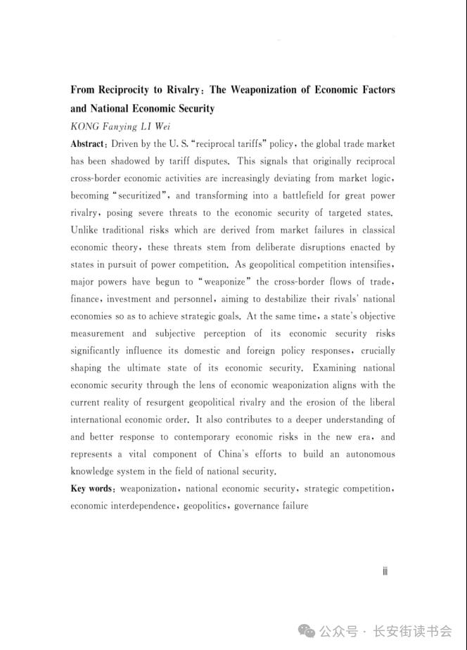 孔繁颖、李巍在《外交评论》2025年第3期撰文《从互惠走向互搏: 经济要素“武器化”与国家经济安全》指出,在美国“对等关税”政策推动下,全球贸易市场被关税阴云笼罩。这标志着原本互惠的跨国经济活动不断背离市场逻辑、日益被“安全化”,成为大国战略互搏的战场,严重威胁相关国家的经济安全。这种经济安全威胁并非源于传统经济学视角下的市场失灵,而是国家出于权力斗争需要所施加的蓄意破坏。随着地缘政治竞争的全面回归,大国将贸易、金融、投资与人员等经济要素的跨境流动“武器化”,通过制造对手国家的经济失序来达成自身战略诉求。与此同时,国家对经济安全风险的客观测量与主观感知,也显著影响其内政与外交的政策选择,对经济安全的最终状态具有重要的塑造作用。从经济要素“武器化”的视角审视国家经济安全问题,契合当前大国地缘政治全面回归、自由国际经济秩序遭受破坏的新现实,有助于我们更好地理解和应对新时代背景下的各种经济风险,也有助于中国学界围绕国家安全议题构建自主知识体系。