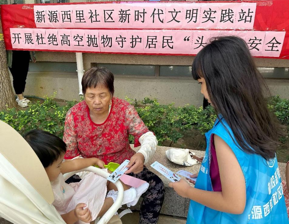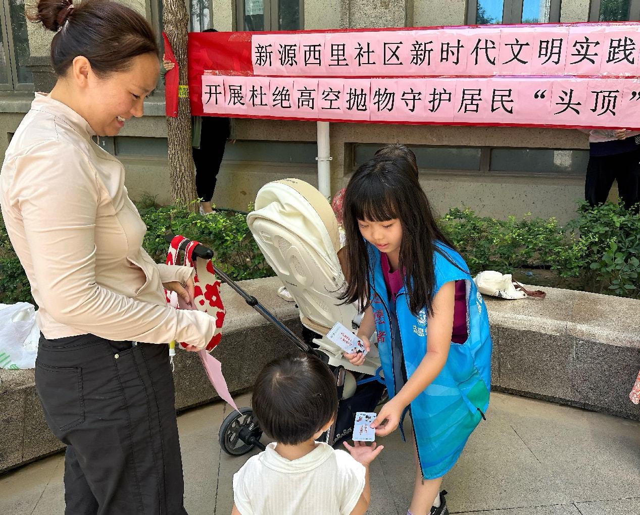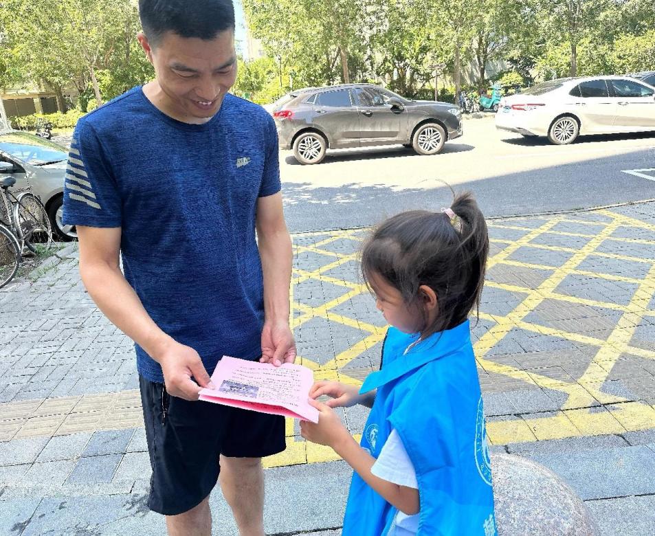 在小区主干道、单元楼入口,热情地将宣传单页递给过往居民。他们仰着稚嫩的脸庞,认真说道:“叔叔阿姨,高空抛物很危险,会砸伤人的,请您一定要注意!”遇到爷爷奶奶,小朋友们还会放慢语速,耐心讲解单页上的内容。居民们被小朋友的热情与认真打动,不仅欣然接过宣传单页,还纷纷为他们点赞。