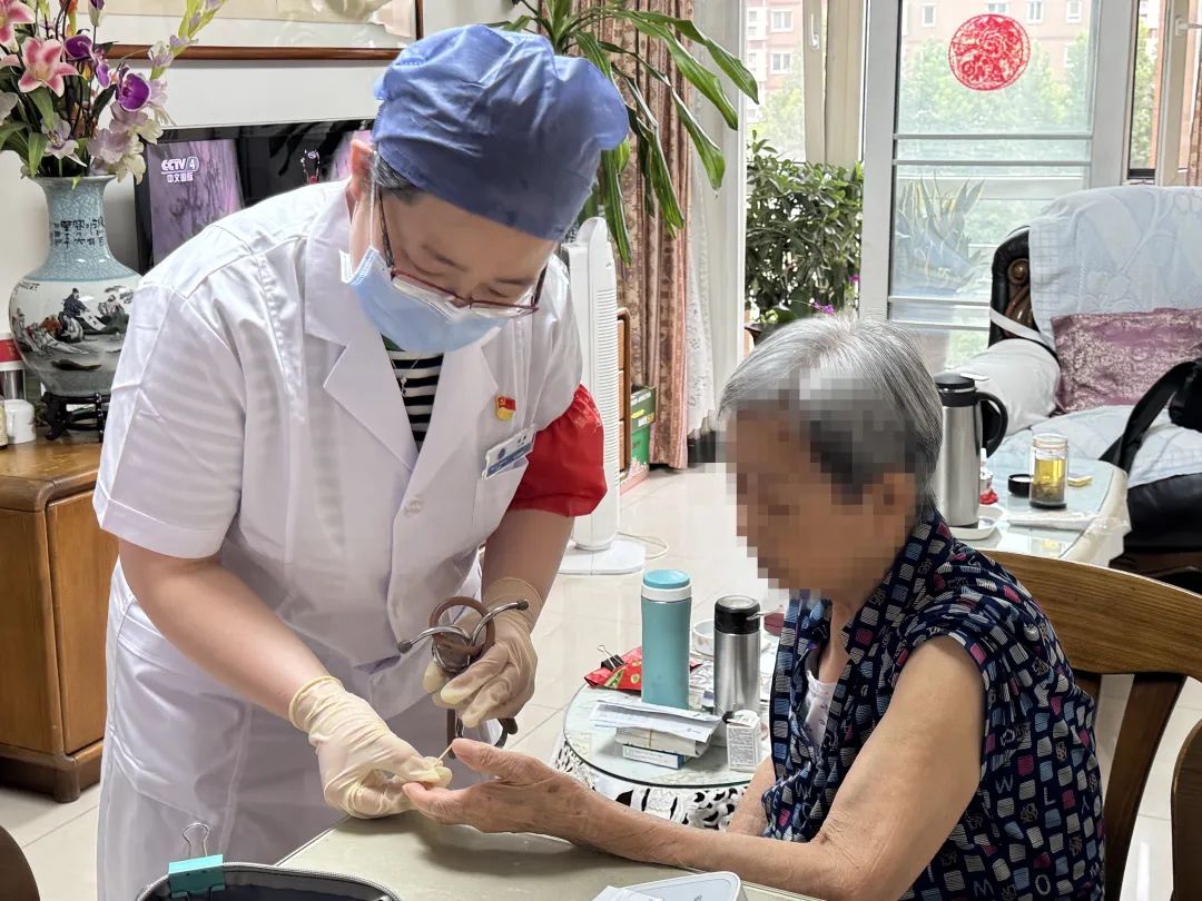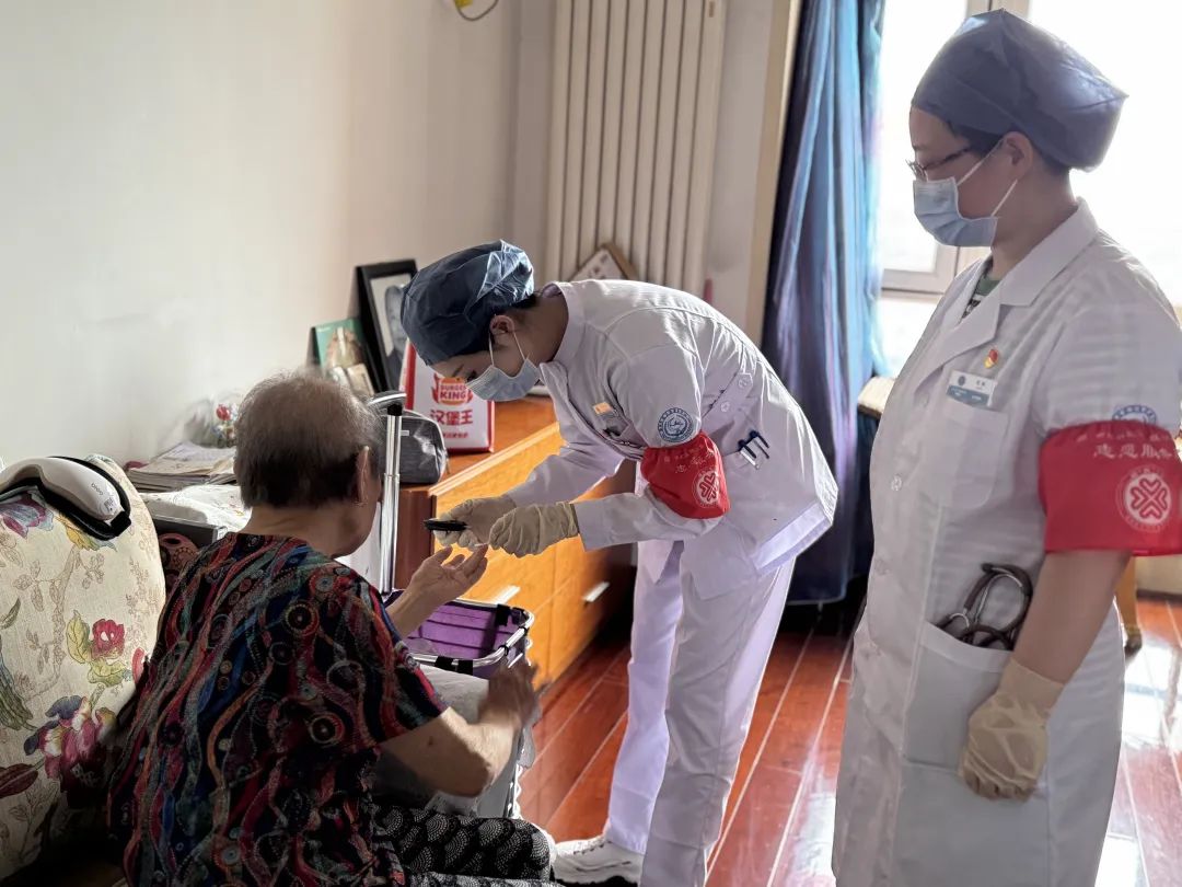 一进门,医护人员就熟络地和王奶奶拉起家常。全科医生胡娜一边为老人测量血压,一边仔细询问近期的身体状况:“降压药按时吃了吗?有没有觉得头晕乏力?”护士刘心宇则熟练地准备好血糖试纸,轻声提醒老人:“稍等一下,取完血样很快就能出结果。”诊疗过程中,医护人员还认真查看了老人家中常备药品的有效期,耐心叮嘱用药注意事项。