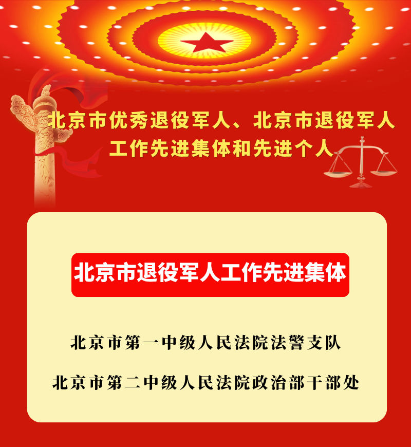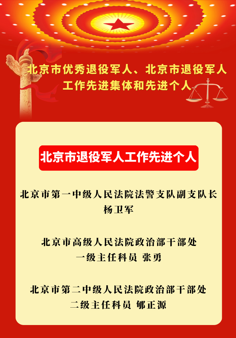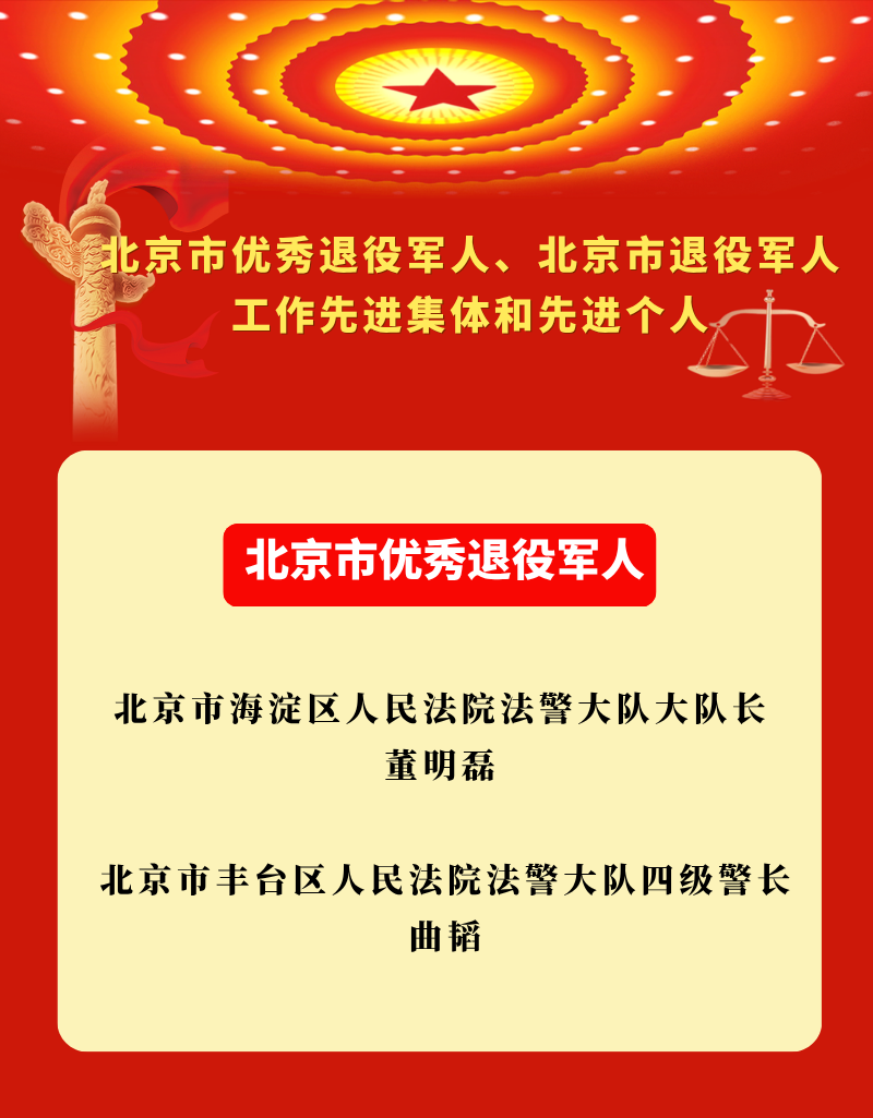 其中,北京市海淀区人民法院法警大队大队长董明磊、北京市丰台区人民法院法警大队四级警长曲韬被授予“北京市优秀退役军人”称号,北京市第一中级人民法院法警支队、北京市第二中级人民法院政治部干部处被授予“北京市退役军人工作先进集体”称号,北京市第一中级人民法院法警支队副支队长杨卫军,北京市高级人民法院政治部干部处一级主任科员张勇,北京市第二中级人民法院政治部干部处二级主任科员郇正源被授予“北京市退役军人工作先进个人”称号。