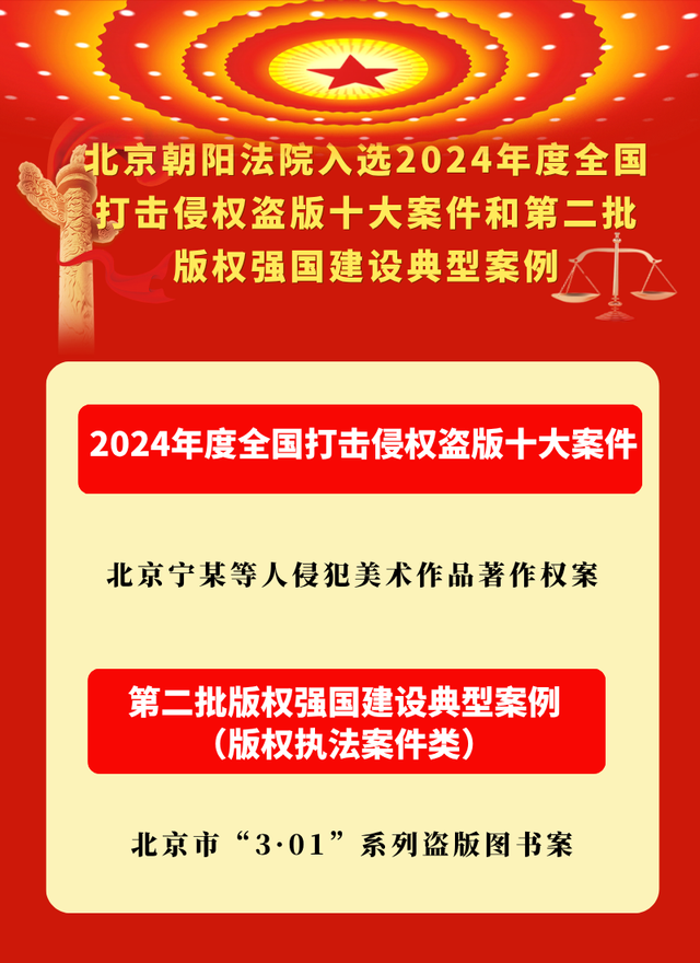 7月31日,由中央宣传部版权管理局主办,安徽省版权局、合肥市人民政府协办的第九届中国网络版权保护与发展大会在合肥举办,大会发布了“2024年度全国打击侵权盗版十大案件”和“第二批版权强国建设典型案例”。其中,北京朝阳法院1个案例入选“2024年度全国打击侵权盗版十大案例”,1个案例入选“第二批版权强国建设典型案例”。