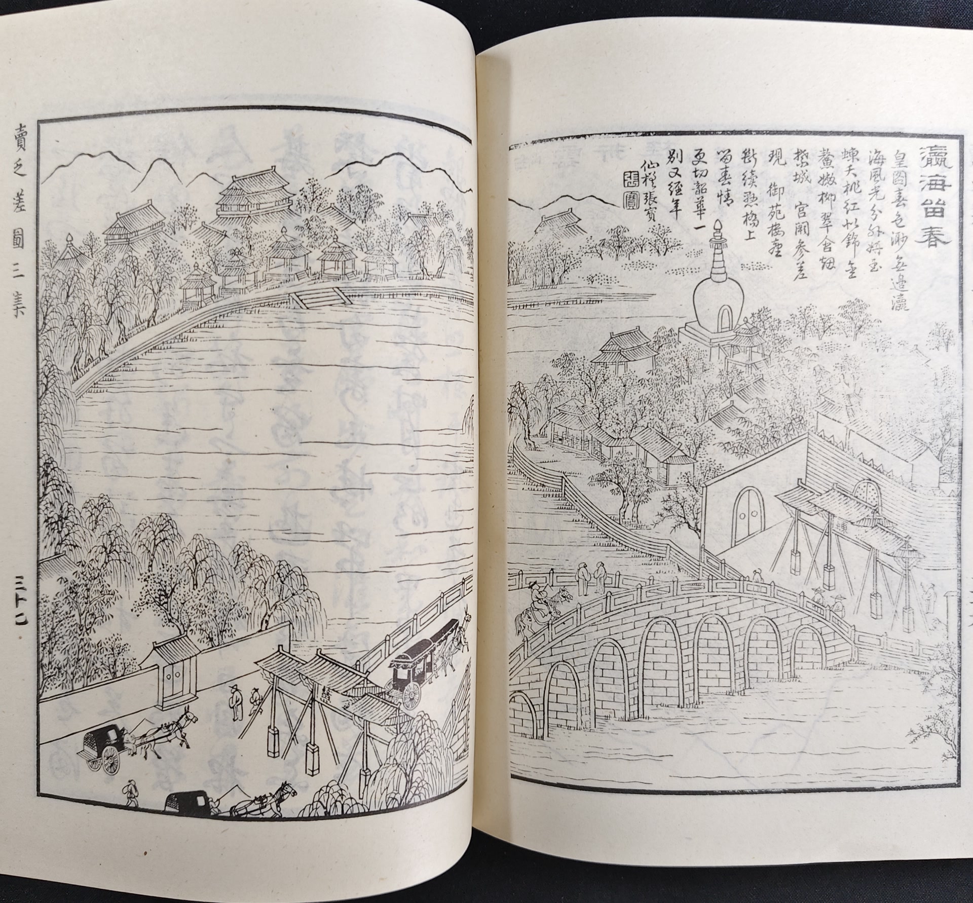 《瀛海留春》一幅再现了清代中叶的“琼岛春荫”和金鳌玉蝀桥。金鳌玉蝀桥原名金海桥,又叫御河桥,俗称北海大桥。是北京市城区内最大的九孔古石桥。明弘治二年(1489)建成,它在团城脚下,横跨于北海与中海之间。桥的两端原有明代嘉靖皇帝所建的牌坊,桥西牌坊的匾额是“金鳌”,桥东牌坊的匾额是“玉蝀”,故称“金鳌玉蝀桥”。旧时的金鳖玉蝀桥总长156.73米,桥宽9.48米。1954年牌坊拆除,桥名改称北海大桥。拆掉后的两个牌坊,移到了陶然亭公园,后被当做“四旧”销毁。
