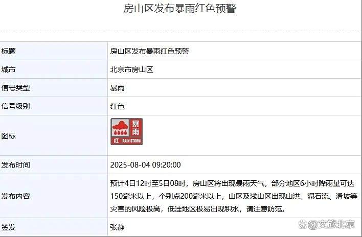 房山区发布暴雨红色预警