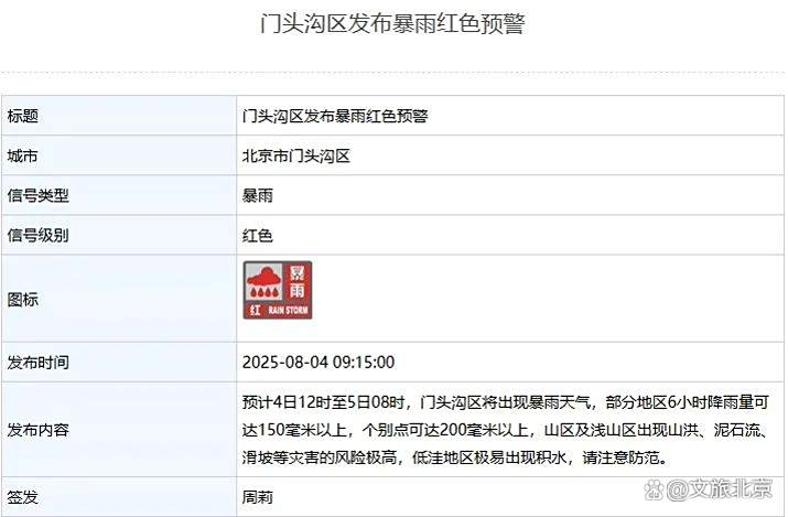 门头沟区发布暴雨红色预警