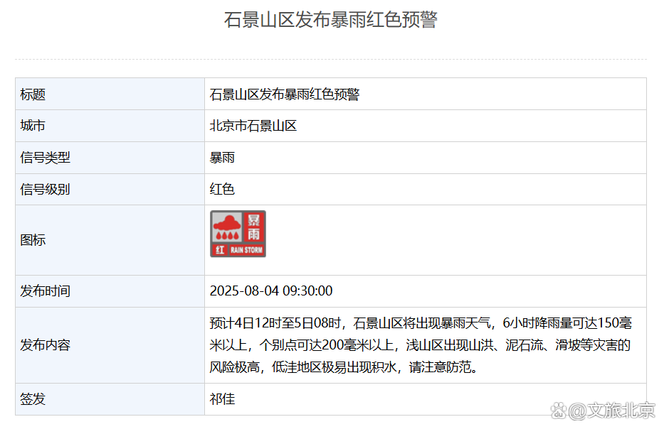 石景山区发布暴雨红色预警:预计4日12时至5日08时,石景山区将出现暴雨天气,6小时降雨量可达150毫米以上,个别点可达200毫米以上,浅山区出现山洪、泥石流、滑坡等灾害的风险极高,低洼地区极易出现积水,请注意防范。