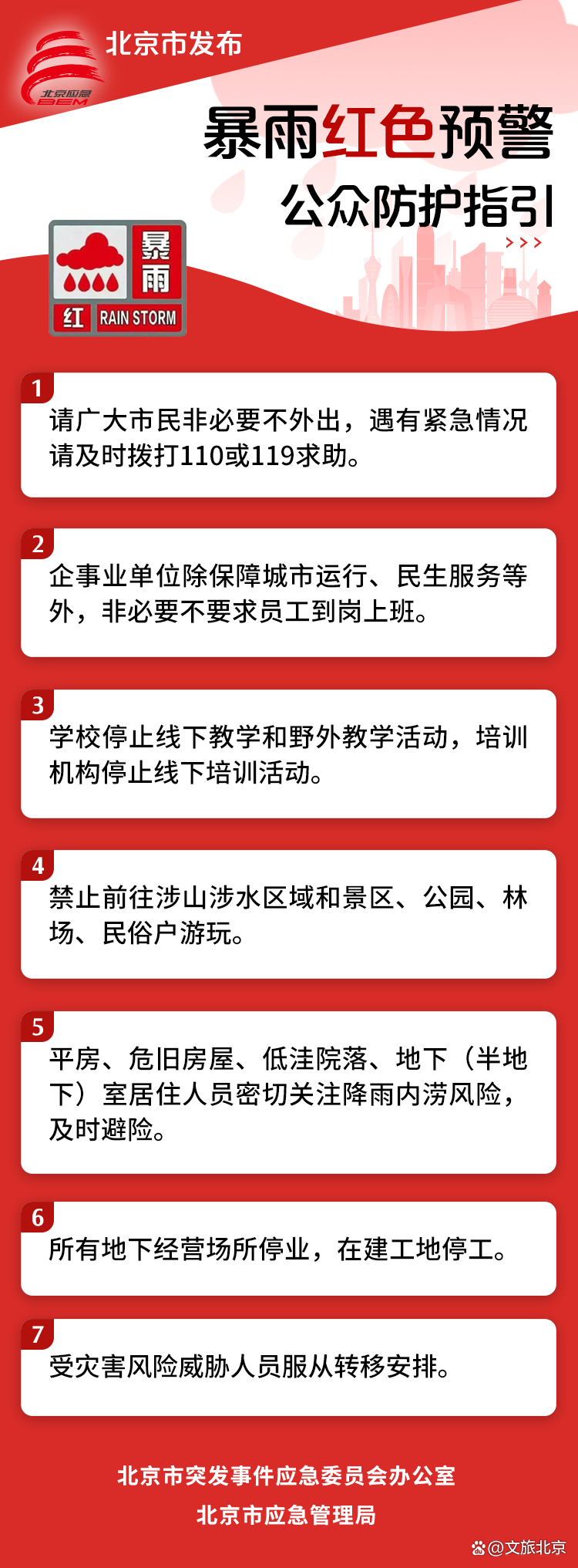 【北京市文化和旅游局温馨提示】受近期连续降雨影响,我市山区及浅山区出现山洪、泥石流、滑坡等灾害的风险极高,请广大游客密切关注天气预警信息,提高风险意识,避免前往山区及涉山涉水景区、露营地、民宿游览和住宿,确保自身安全。