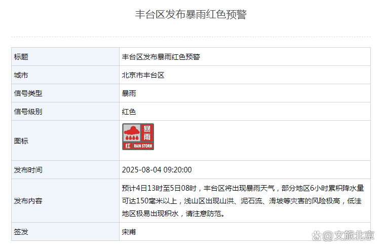 丰台区发布暴雨红色预警