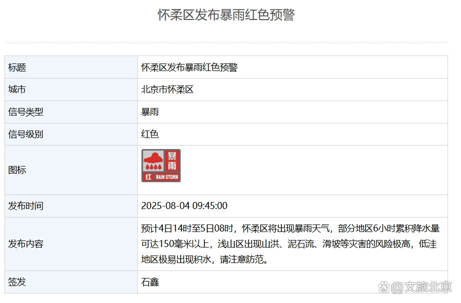 怀柔区发布暴雨红色预警:预计4日14时至5日08时,怀柔区将出现暴雨天气,部分地区6小时累积降水量可达150毫米以上,浅山区出现山洪、泥石流、滑坡等灾害的风险极高,低洼地区极易出现积水,请注意防范。