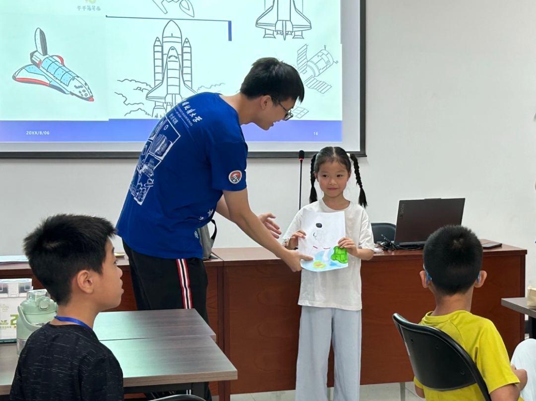 讲师为每位参与者发放了马克笔、画纸等材料,鼓励大家融入自创科幻元素,将脑海中的未来世界落笔成形。有的画笔下,是能实现“能源自给”的悬浮飞艇,建筑外墙覆盖着可吸收太阳能与风能的智能材料;有的则构想了“无人医疗”未来画面,还有的设计了“电子生态系统”,废弃电子设备能自动分解重组为新的能源载体。率先完成作品的参与者不仅获得了小礼物作为奖励,还化身“小导师”,协助其他伙伴完善创意。