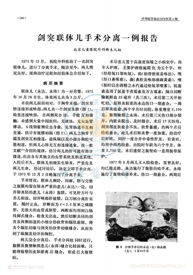 论文《剑突联体儿手术分离一例报告》刊发在《中华医学杂志》1978年第4期