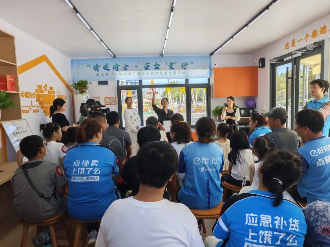 党群服务中心的服务不仅局限于空间内,更延伸至解决群众的急难愁盼问题。针对外卖电动自行车占道影响通行这一难题,兴谷街道迅速联动万达管理方、属地社区及外卖骑手代表进行会商,划定专属停车取餐区域并设置文明引导标识。同时,依托“暖心驿站”举办“情暖骑士・安全‘童’行”主题活动,通过安全知识互动、亲子协作游戏、非遗文化体验以及联动商户参与等形式,传递城市温度,有效增强新就业群体的认同感与归属感。