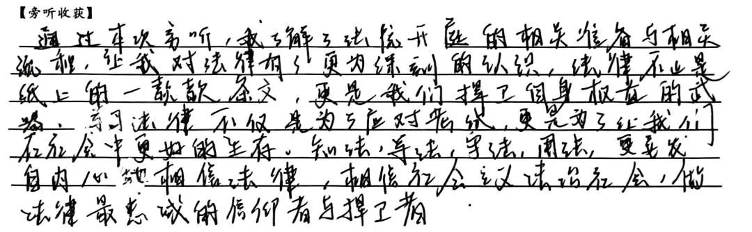 本次在法院旁听庭审的经历,让我真切感受到了法律的庄严。当法槌敲响的瞬间,整个法庭鸦雀无声,我的心也跟着提了起来。同时,我也更深刻的理解到证据是诉讼的灵魂,若想通过法律工具来维护自身的合法权益,证据是必不可少的,我们应在日常生活中树立证据意识,时时留证并谨慎的保存证据。