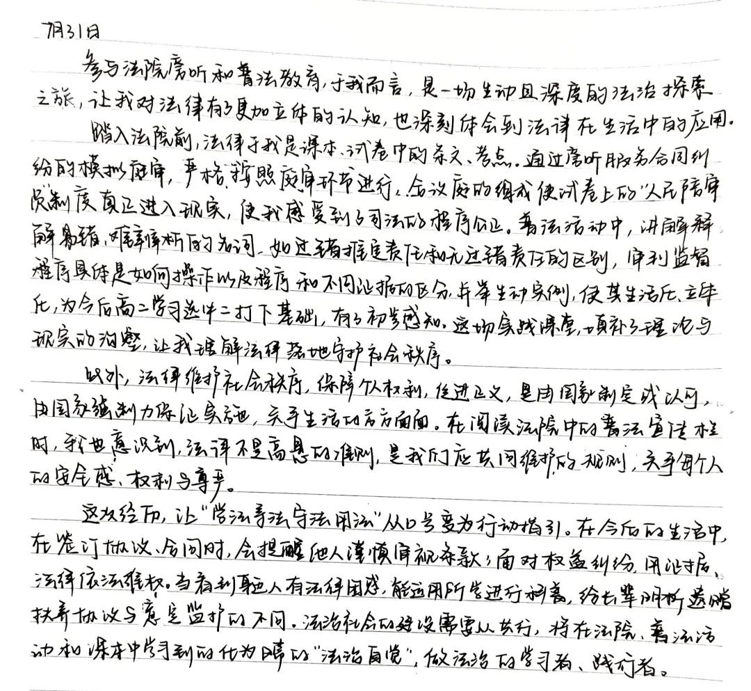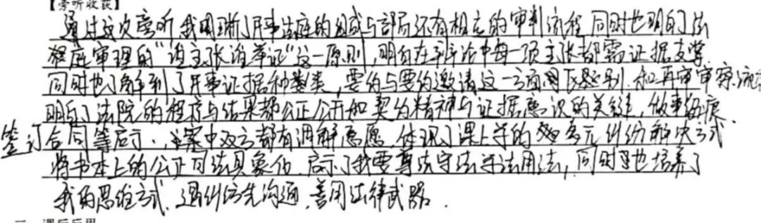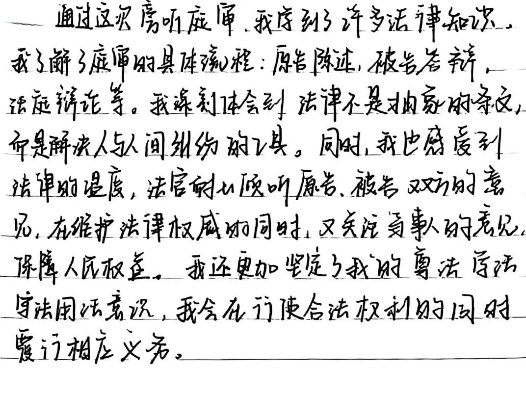 这次去海淀法院旁听两公司合同纠纷庭审,让我有很多收获。原告依证据主张权利,被告据法条抗辩。课本里的民法条文,此刻成了定分止争的标尺。它既规范市场交易行为,维护市场经济秩序,又保障社会公平正义,是中国特色社会主义法治体系的重要支撑。这次旁听,不仅让法治精神具象化,还让我更深刻的理解了选必二《法律与社会》的知识,增强了法治思维。