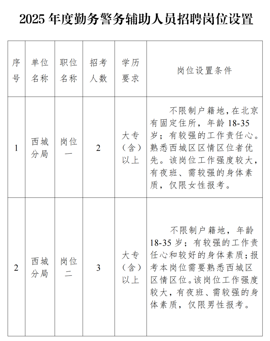 北京市公安局西城分局现面向社会公开招聘勤务辅警。公安勤务辅警属于警务辅助人员,是面向社会公开招聘,由公安机关直接管理使用、为公安机关警务活动及相关工作提供辅助支持、不具有人民警察身份的工作人员。招聘相关事项如下: