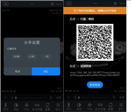 分享设置界面选择“分享时效”后点击确定,就会加载分享链接或二维码,二维码和链接在分享时效内有效,点击复制链接发送给他人,或者他人扫描二维码,即可查看分享的影像。