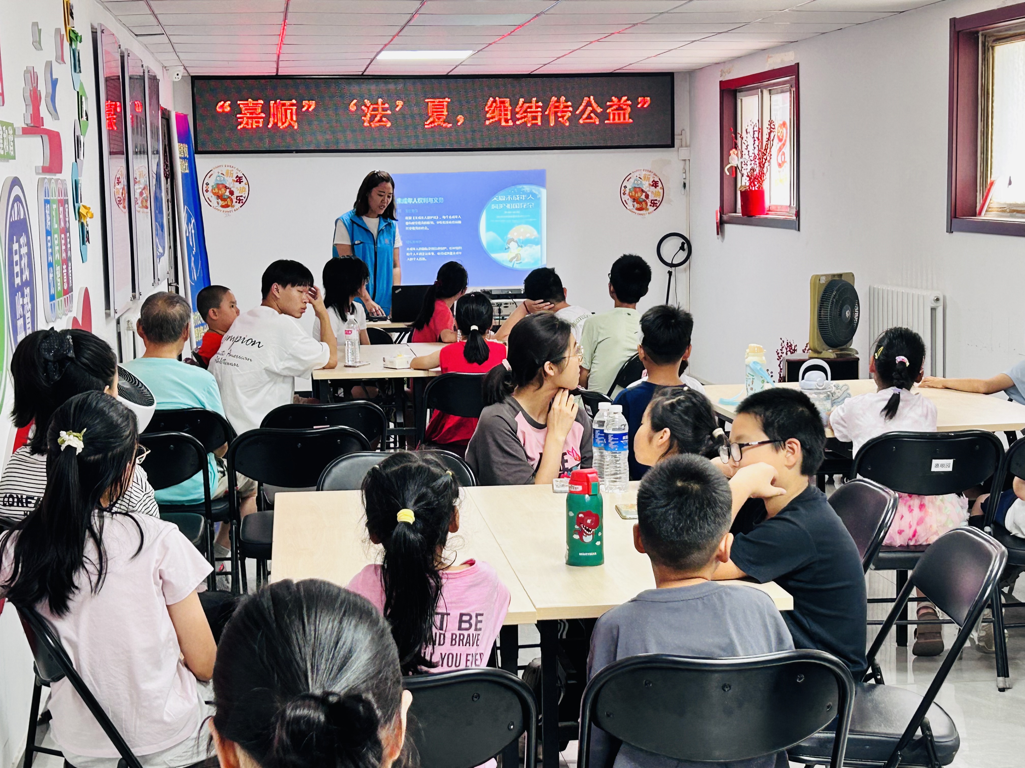 “嘉顺‘法’夏,绳结传公益”中,普法知识与传统技艺碰撞出别样火花。社区普法志愿者先以真实案例剖析校园霸凌的危害,教孩子们识别霸凌、勇敢说“不”;再结合网络刷单、虚假中奖等常见骗局,拆解反诈技巧,筑牢青少年的安全防线。随后,志愿者手把手教学编织传统“万字结”,让法治理念与非遗技艺在指尖共传承,让孩子们学习法律知识的同时又体验到了中国传统技艺的魅力。