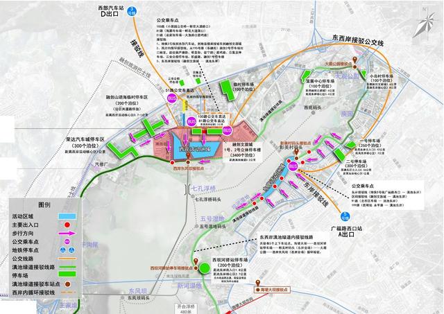碧鸡路百集龙停车场、云安会都停车场、临时停车场等多个停车场,距离西岸活动核心区2公里。