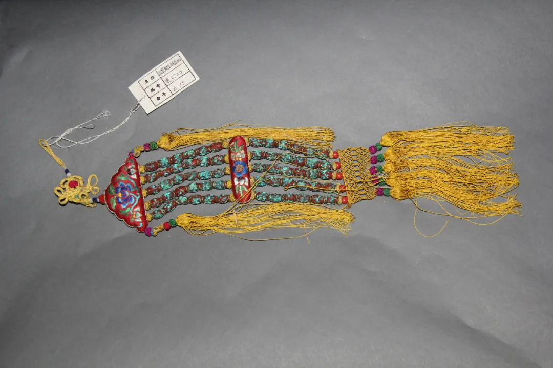 且慢,这串念珠也是紫金锭做的。你说我乱说话,紫金锭是紫色的,这个是蓝色的。这个确实是紫金锭做的,全名是“包蓝线佩璎珞紫金锭念珠”。这串念珠确实是紫金锭制作的,但是外面用蓝色的丝线包裹起来了。