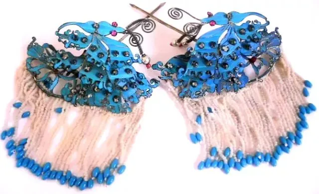 “点翠”,大家知道点翠工艺是一项中国传统的金银首饰制作工艺,这种工艺汉代就已经出现了。它是首饰制作中的一个辅助工种,起着点缀美化金银首饰的作用。用点翠工艺制作出的首饰,光泽感好,色彩艳丽。点翠工艺的发展在清代康熙、雍正、乾隆时期达到了顶峰,显示出其高超的技艺水平和不朽的艺术价值。点翠工艺一般是在钗、簪、钳、钿子等高级的首饰上面,用翠鸟的羽毛装饰。