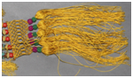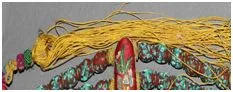 看到了吗,柔软细腻的羽毛被镶嵌到紫金锭里,镶嵌成六角凌花形状。百年时间过去了还是闪着淡淡的、温柔的光。每粒紫金锭都是被小巧的金环相隔着,6粒一串,5串为一组。上下两组中间用织绣的锦缎相隔,很像皇后朝冠后面坠的“五行二就”的形式,上下都有黄绒丝绦坠角,证明这是皇家东西。