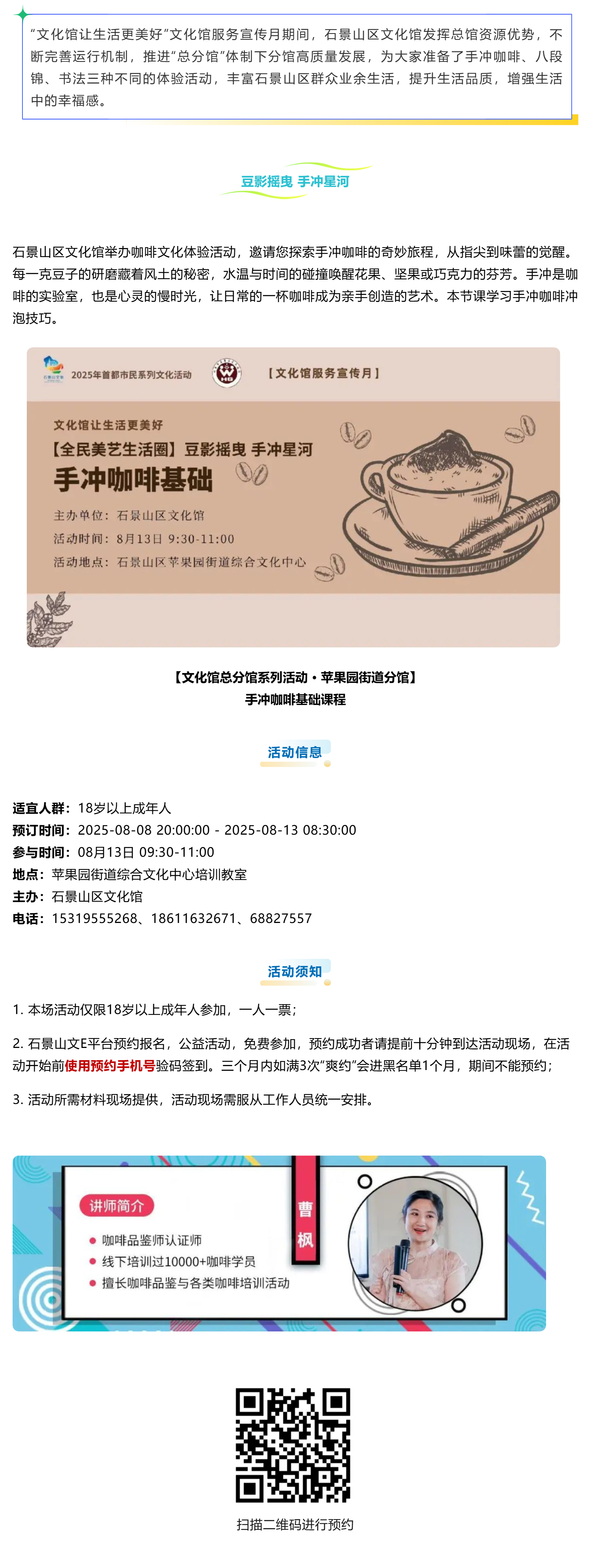 【文化馆服务宣传月•总分馆系列活动】墨香韵味、气韵八段、手冲咖啡,悠享文化休闲时光