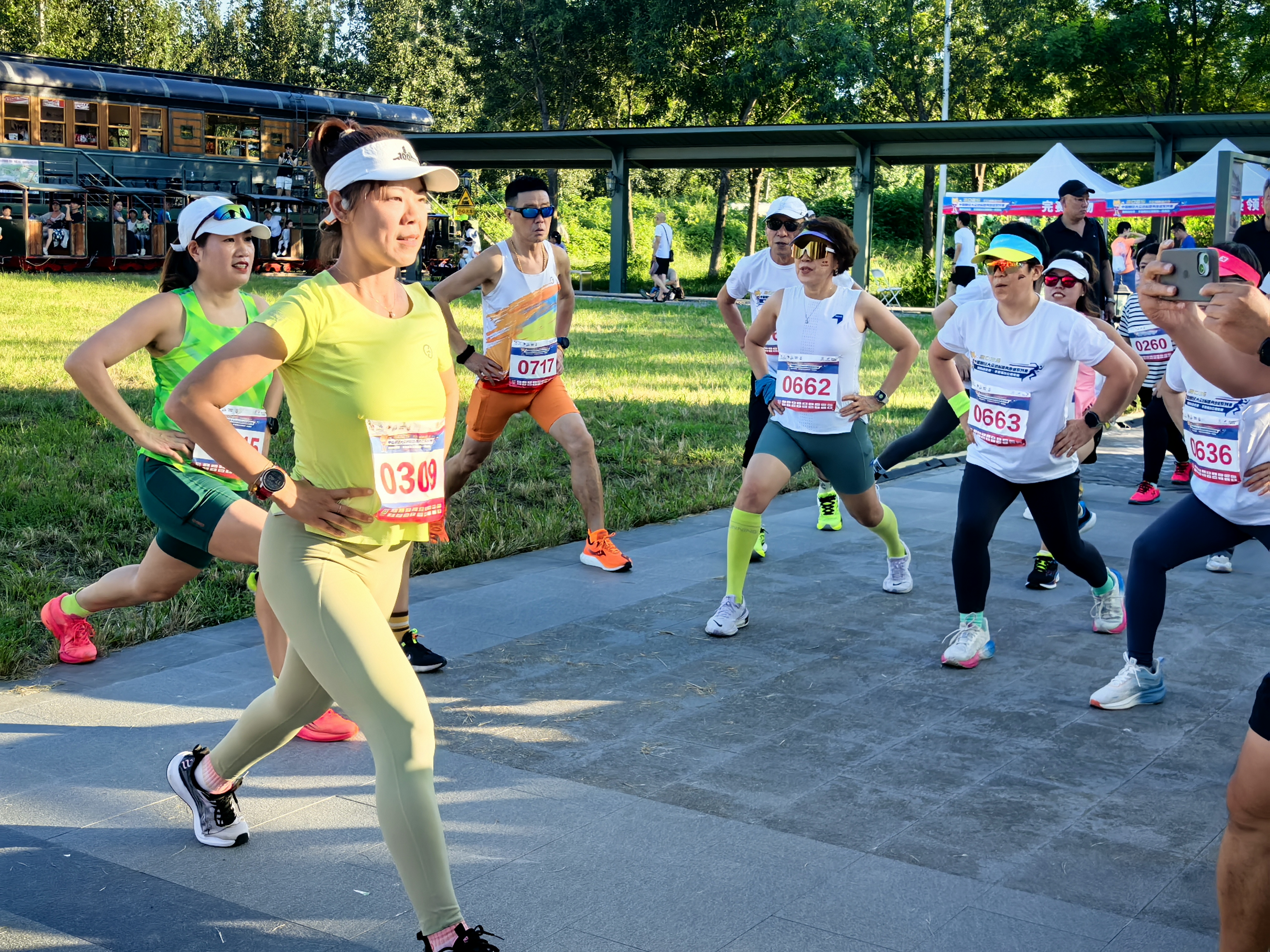 作为专为亲子家庭打造的运动盛宴,5000米健康跑的发令枪响时,身戴号码牌的人流如溪流般汇入森林步道。赛道沿公园景观逆时针铺开,两圈5公里的路程串联起林溪汇芳的潺潺水声、槐林清荫的斑驳光影,还有复古风的小火车站。伴随着铁轨旁的野花随晚风轻摇,鸟鸣与脚步声合奏共鸣,夜跑成为一场沉浸式自然探索。选手们在活动中不仅能欣赏公园内的秀美景致,还能感受到浓厚的运动氛围和城市的蓬勃活力。“爸爸!我们一定能坚持下来两圈!”“我们比小火车跑得还快呢!”跑道上时不时传来“大小”跑者们的欢声笑语。