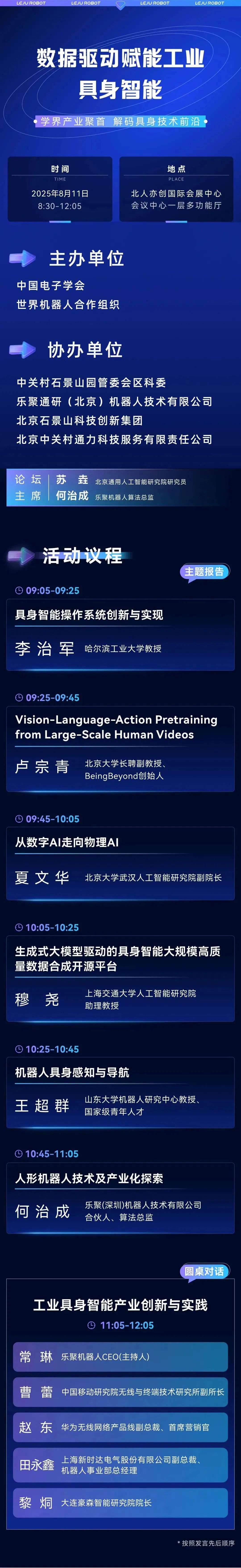 2025世界机器人大会(WRC 2025)是汇聚全球机器人领域顶尖创新资源与前沿技术的顶级国际盛会之一。大会期间,由中国电子学会、世界机器人合作组织主办,中关村石景山园管委会区科委、乐聚通研(北京)机器人技术有限公司、北京石景山科技创新集团、北京中关村通力科技服务有限责任公司承办的“数据驱动赋能工业具身智能活动”将作为WRC 2025的专场论坛,聚焦工业智能和具身智能的融合创新。