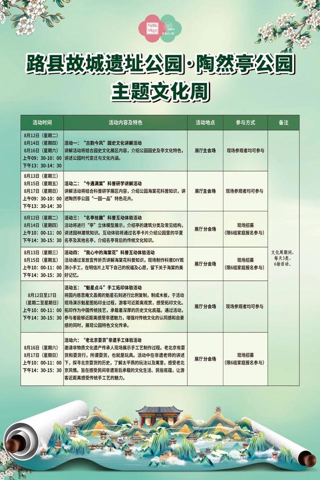 8月12日至17日,“陶然亭公园・路县故城遗址公园主题文化周”将在通州区路县故城遗址公园启幕。活动以“陶然雅集・古韵今风”为主题,打造沉浸式文化体验。文化周期间,市民可体验魁星点斗手工拓印体验活动,亲自制作一幅寓意吉祥的魁星图。
