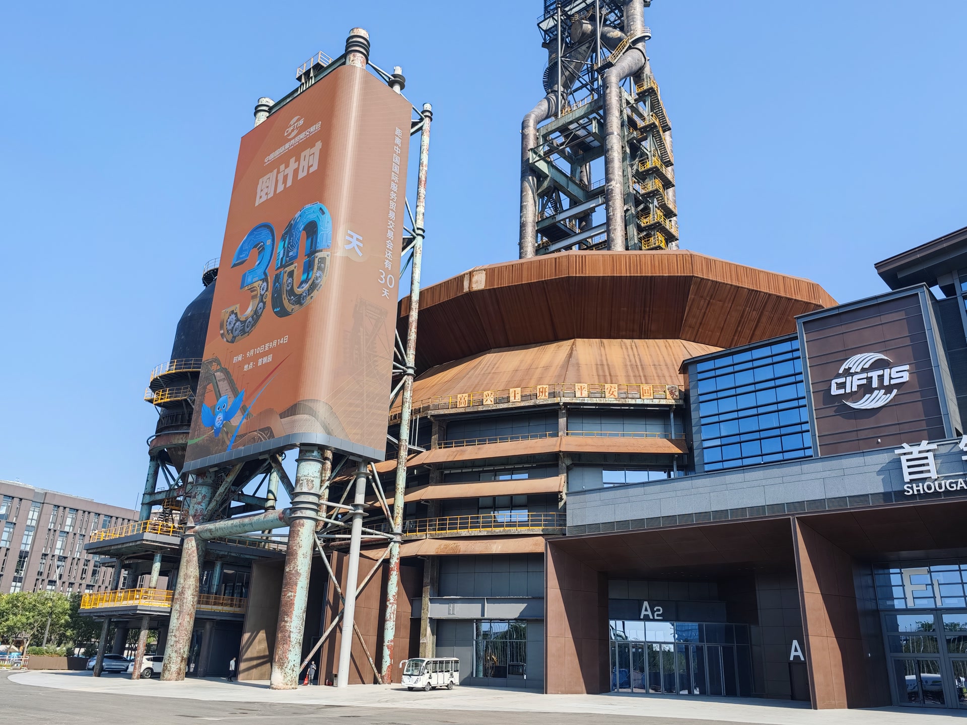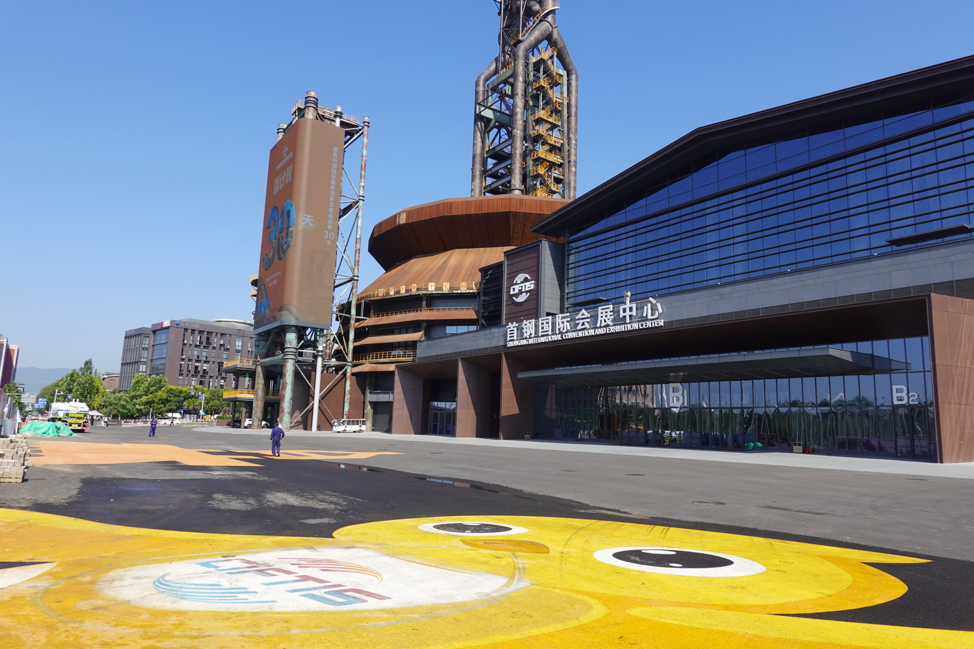 本届服贸会整体布置以提升便捷性、节俭性、功能性为主要原则,以首钢工业为魂、会展为基、生态为眸、文化为势,结合首钢工业遗存、冬奥设施等特色建筑进行服贸会独有的氛围营造,打造会展小镇。导引导视形成五级体系,涵盖车流人流指引、小镇范围场景布置、会展核心区规划、场馆夜间活动场地和场馆内设施等各类指引,整体数量较上届增加60%以上。同时,首钢园区的各个草坪成为文创展示、商务洽谈、小型活动、工业风茶歇等活动场地,人文自然充分融合。