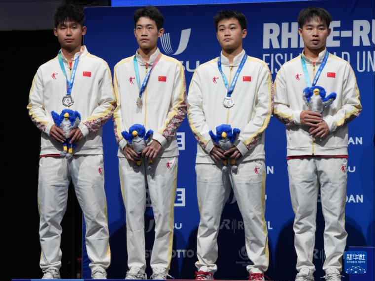 7月20日,中国队选手敖华磊、陈俊崧、孙正、曾蓓勋(从左至右)在颁奖仪式上。新华社记者 王曦 摄
