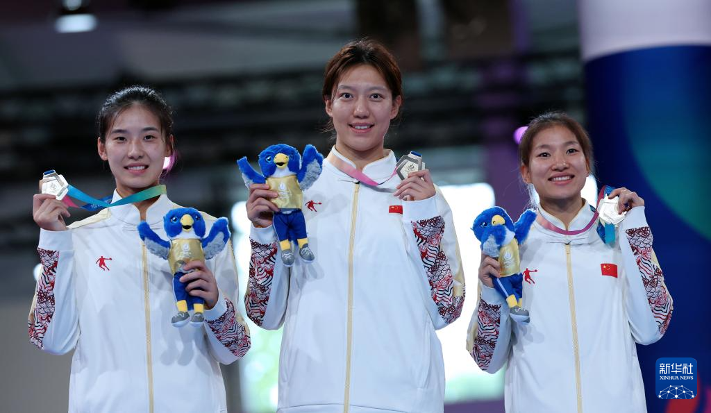 7月23日,冠军中国队选手穆文喆(中)、邢佳妮(左)和郭清在颁奖仪式上。新华社记者 李颖 摄