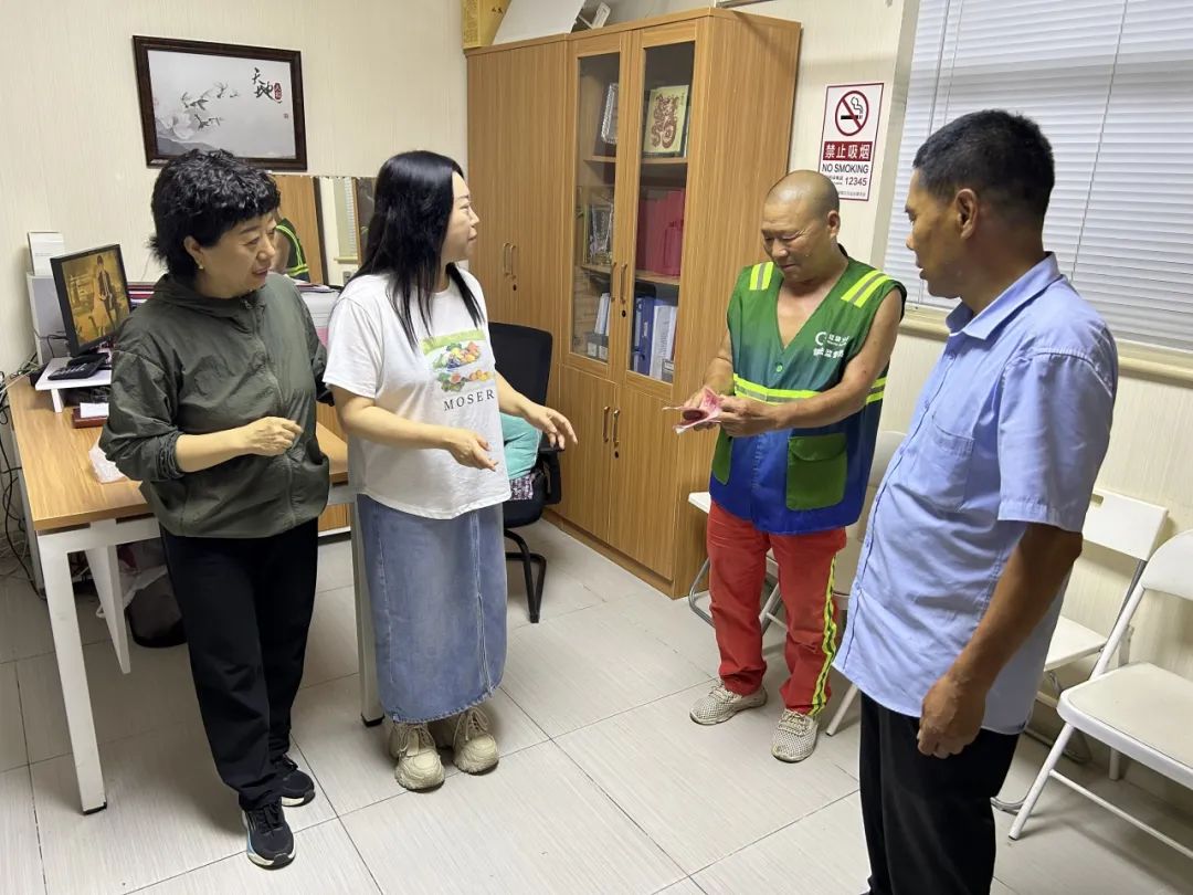 中午11点半,老人打电话一提这事儿,孙先生和安女士瞬间慌了神!赶紧给和平家园社区党委书记范春莉发微信求助。范书记一看消息,二话不说,立马带着社工们赶到丢垃圾的点位。调监控、问保洁队、找守桶的志愿者……大家分头行动,一点点排查线索。功夫不负有心人,经过一天多的努力,这一万元现金终于被找到了!