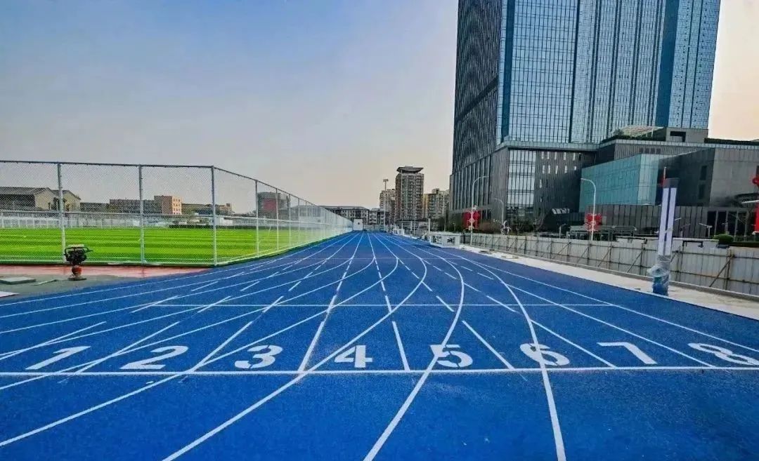 这条环形跑道长400米、宽11.5米,共有8条赛道,选用蓝色混合型塑胶面层,跑感柔软。